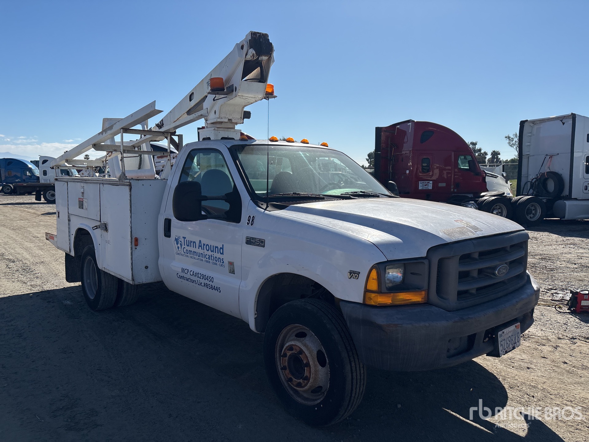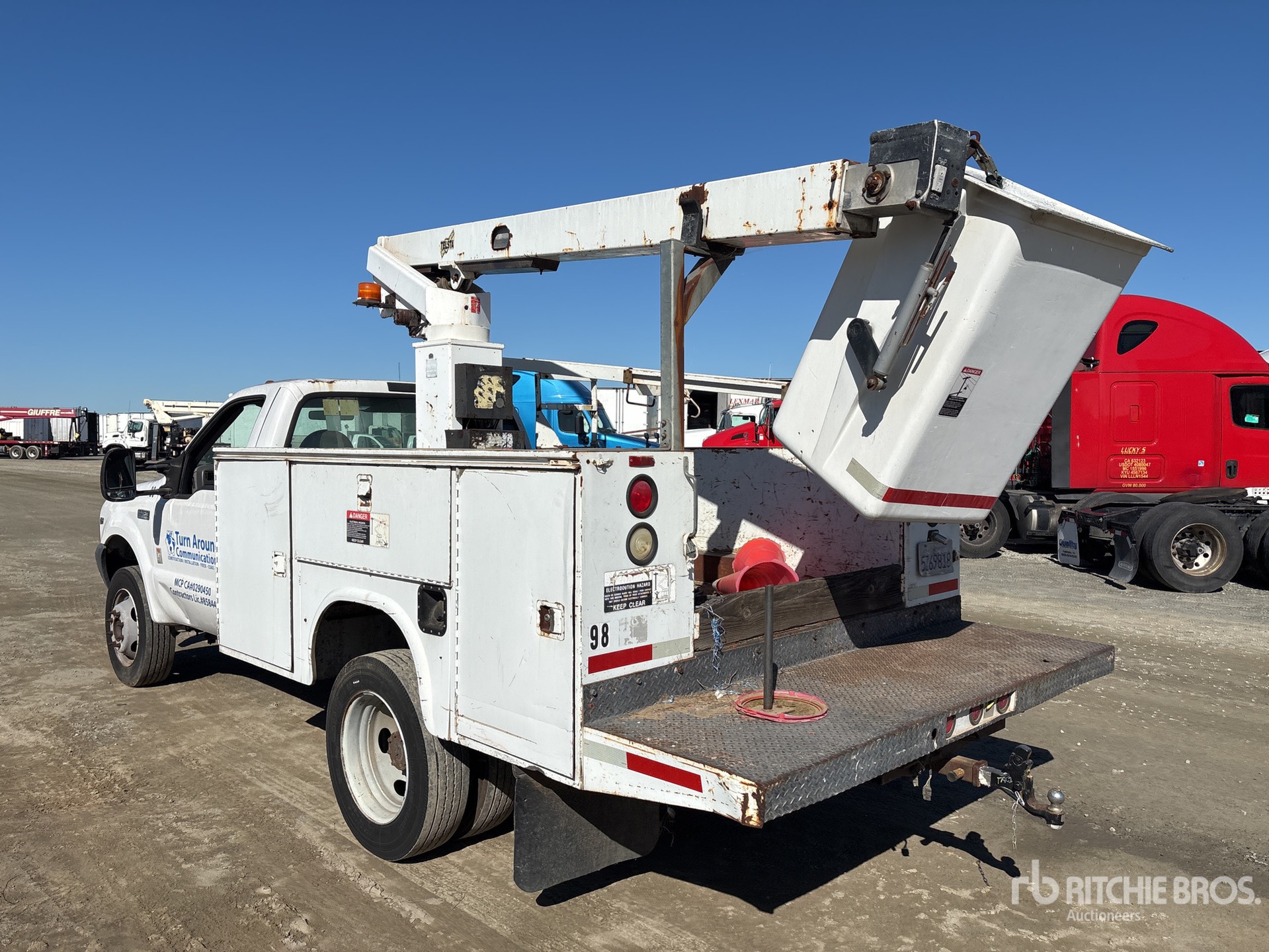 Ford V10 Gasoline Engine, 1999 US EPA Label, Automatic Transmission, 5600 lb Front Axle, 11000 lb Rears, 15000 lb GVWR, 225/70R19.5, Spring Suspension, 141 in Wheelbase, 350 lb Capacity, Front Mounted, One-Person Telescopic Boom, Utility Body, 9 ft x 96 in Bed