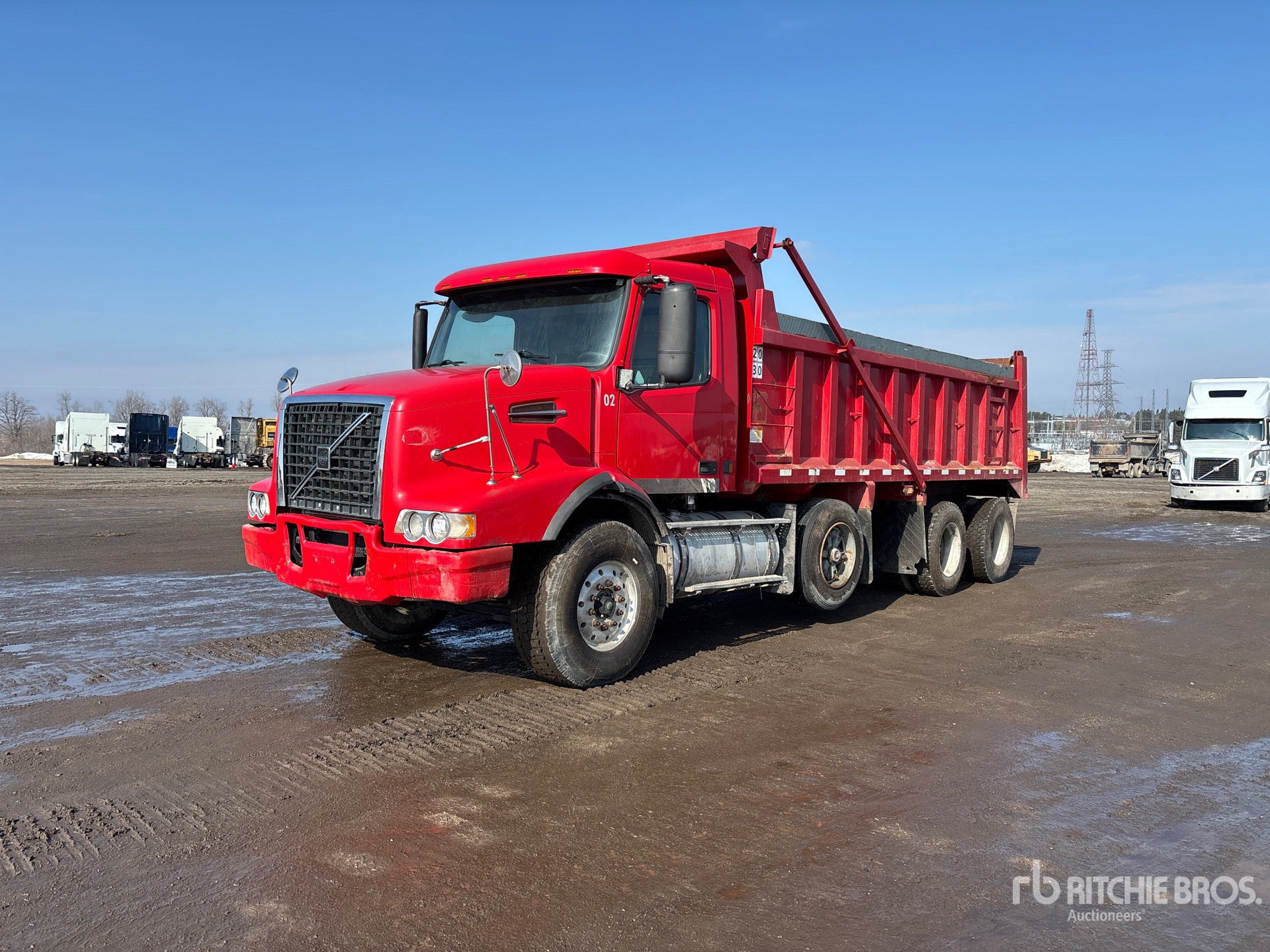 Volvo VE D12 6 Cylinder Diesel Engine, Requires Diesel Exhaust Fluid, Engine Brake, Eaton Fuller RTLO-16918B 18-Speed Manual Transmission, 20000 lb Front Axle, 46000 lb Rears, 66000 lb GVWR, Aluminum Wheels, 425/65R22.5 Front Tires, 11R22.5 Rear Tires, Steerable Air Lift Pusher Axle, Air Ride Suspension, 252 in Wheelbase, PTO, 20 ft 4 in Long x 4 ft High Steel Body, Air Powered Roll Tarp