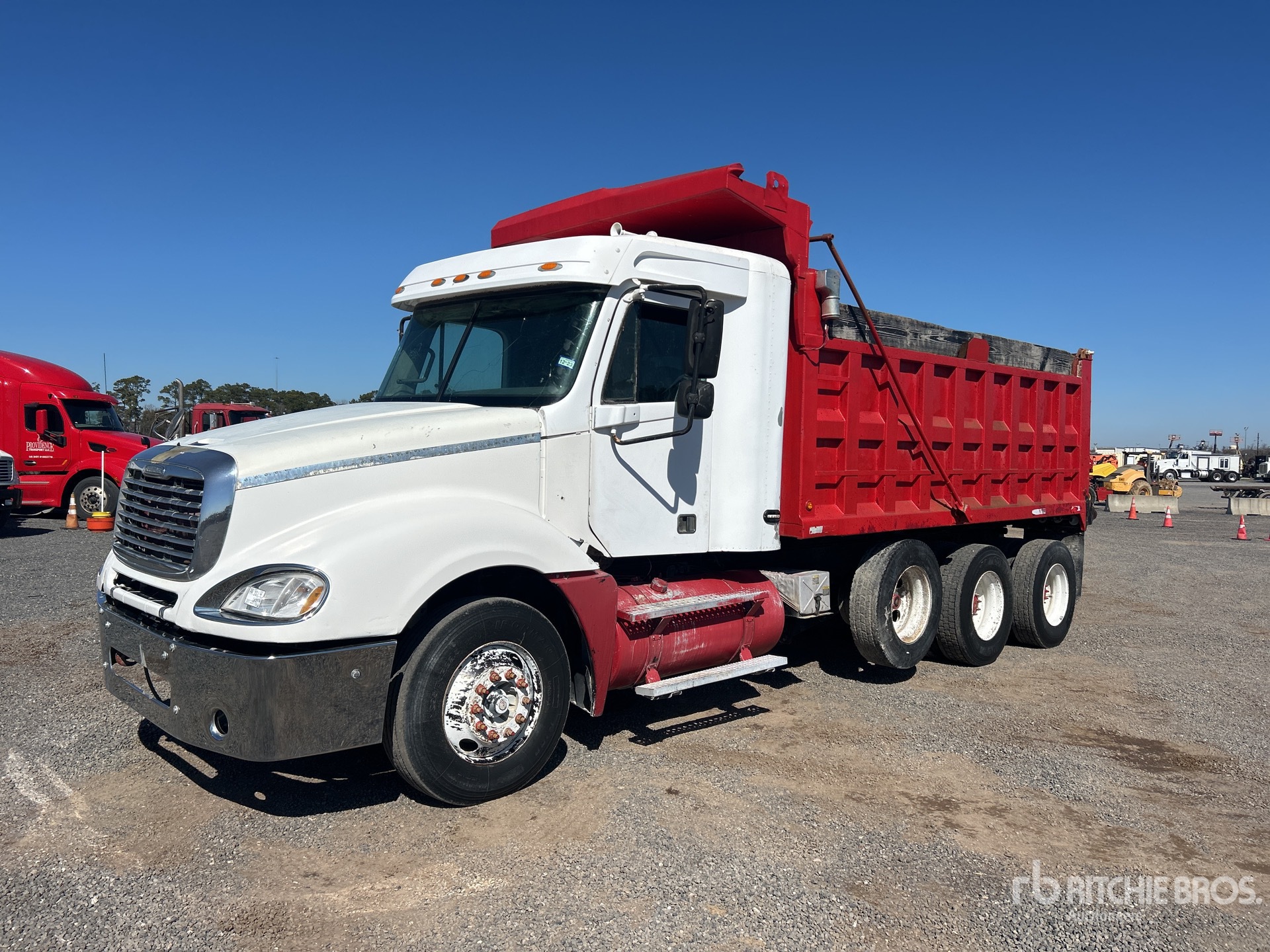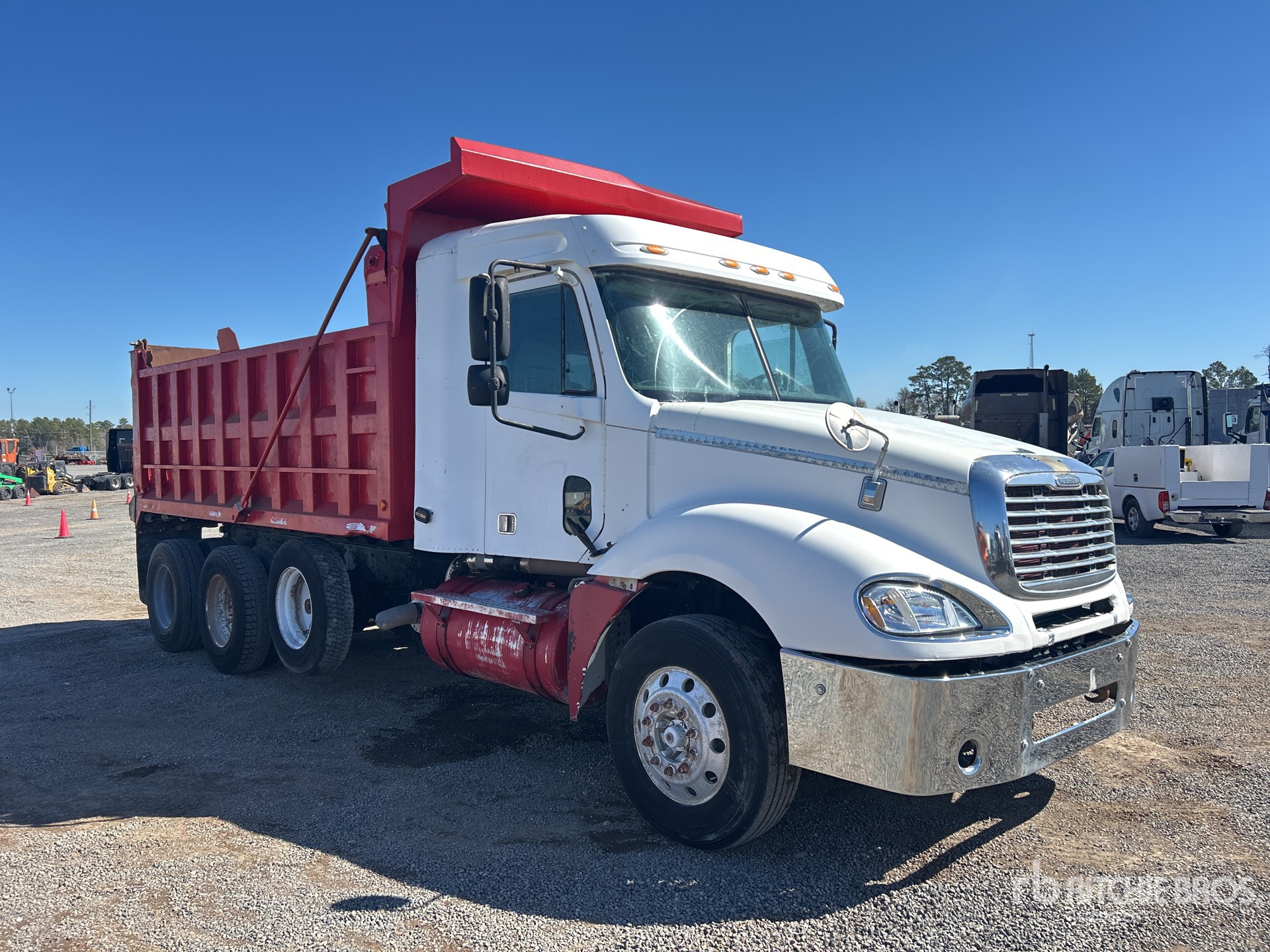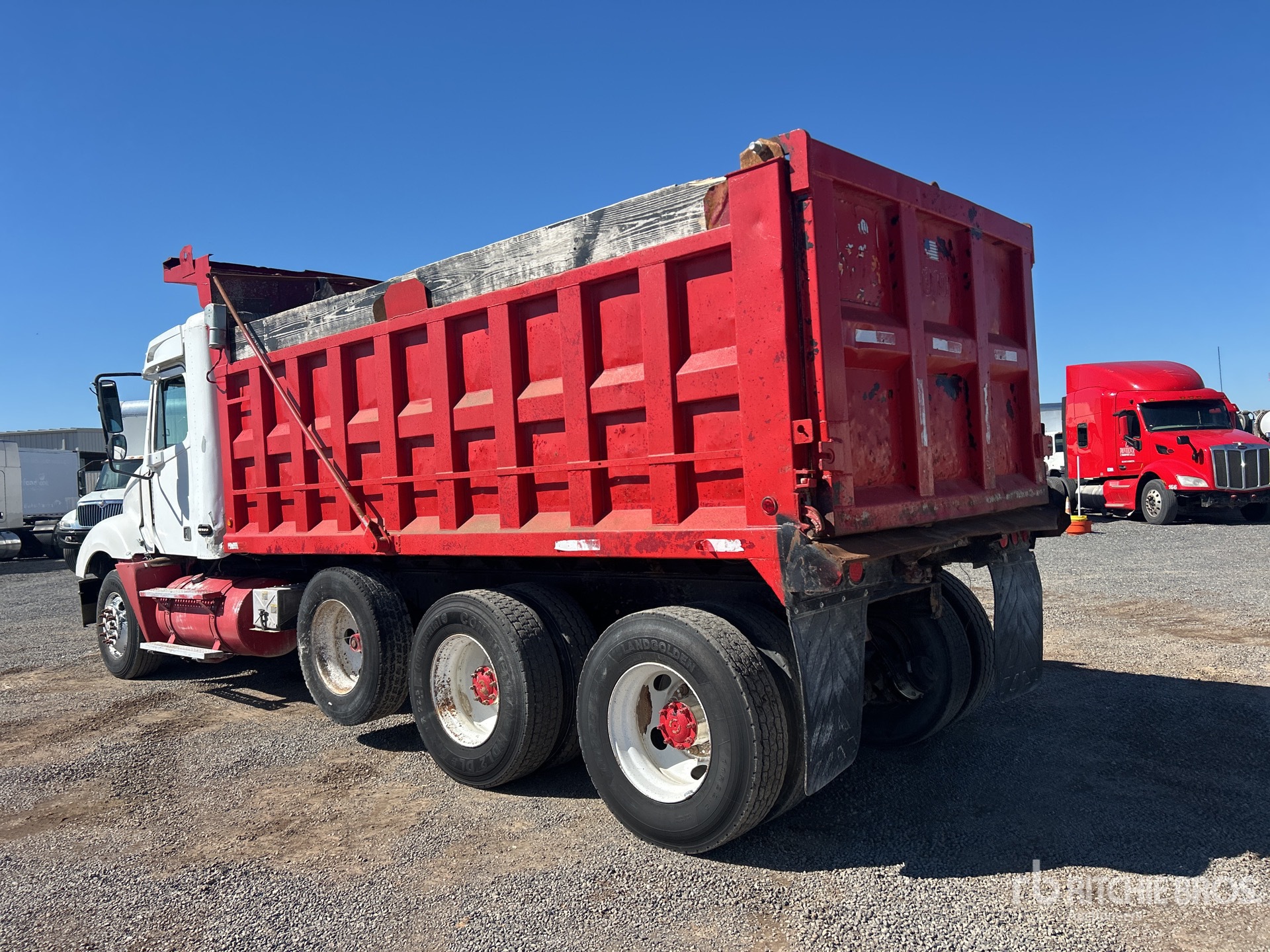 Mercedes-Benz 6 Cylinder 781 cid Diesel 410 hp Engine, 2003 US EPA Label, Engine Brake, Eaton Fuller 10-Speed Manual Transmission, Meritor RT-40-145 Drive Axles, 3.58:1 Axle Ratio, Air Ride Cab, 295/75R22.5 Front Tires, 11R22.5 Rear Tires, Air Lift Pusher Axle, Rubber over Walking Beam Suspension, 232 in Wheelbase, 16 ft Long x 5 ft 2 in High Steel Body, Electric Roll Tarp