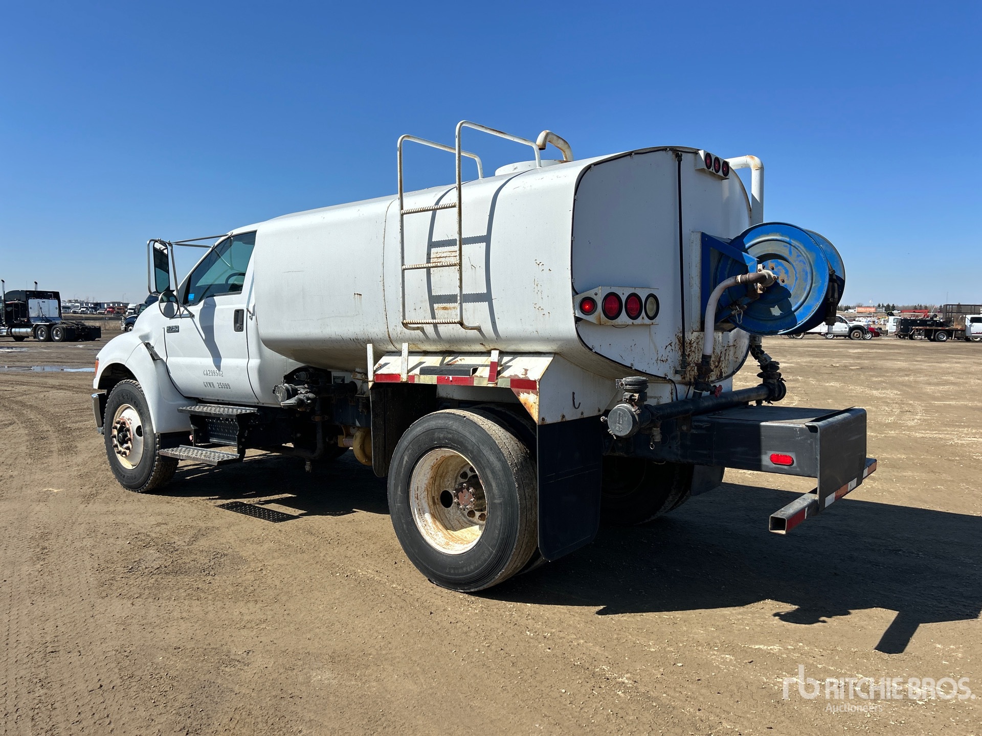 Cummins 6 Cylinder 5.9 L Diesel Engine, 6-Speed Manual Transmission, 10000 lb Front Axle, 21000 lb Rears, 25999 lb GVWR, 11R22.5, Spring Suspension, 160 in Wheelbase, PTO, 2005 United Truck & Equipment 2200 gal Steel Tank, PTO Driven Pump, 7 ft 2 in, Spray Bar, Hose Reel, Front Spray, Rear Spray, Side Spray