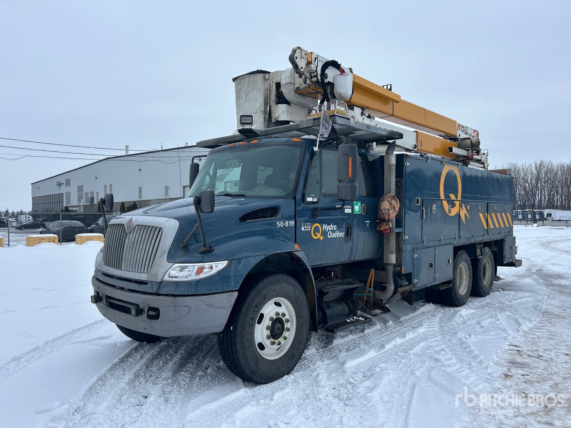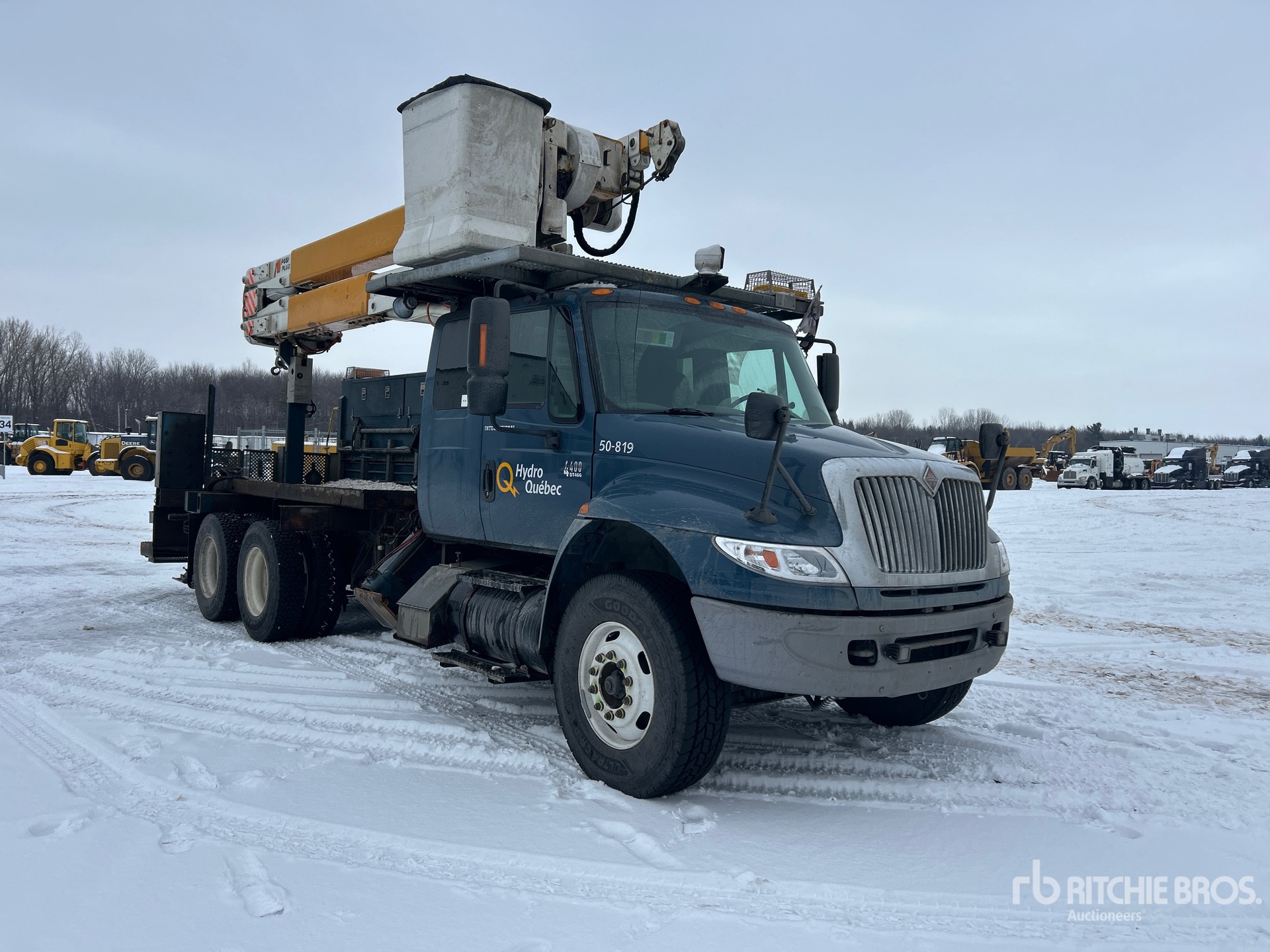 International DT466 6 Cylinder 7.6 L Diesel 285 hp Engine, 2005 US EPA Label, 11395 Engine hrs, Engine Brake, Allison Automatic Transmission, Differential Lock, 14000 lb Front Axle, 40000 lb Rears, 24494 kg GVWR, 315/80R22.5 Front Tires, 11R22.5 Rear Tires, Air Ride Suspension, 219 in Wheelbase, PTO, 350 lb Capacity, Front Mounted, One-Person Articulated Boom, Utility Body, A-Outriggers, Rear Outriggers, 18 ft 6 in x 100 in Bed, Pintle Hitch