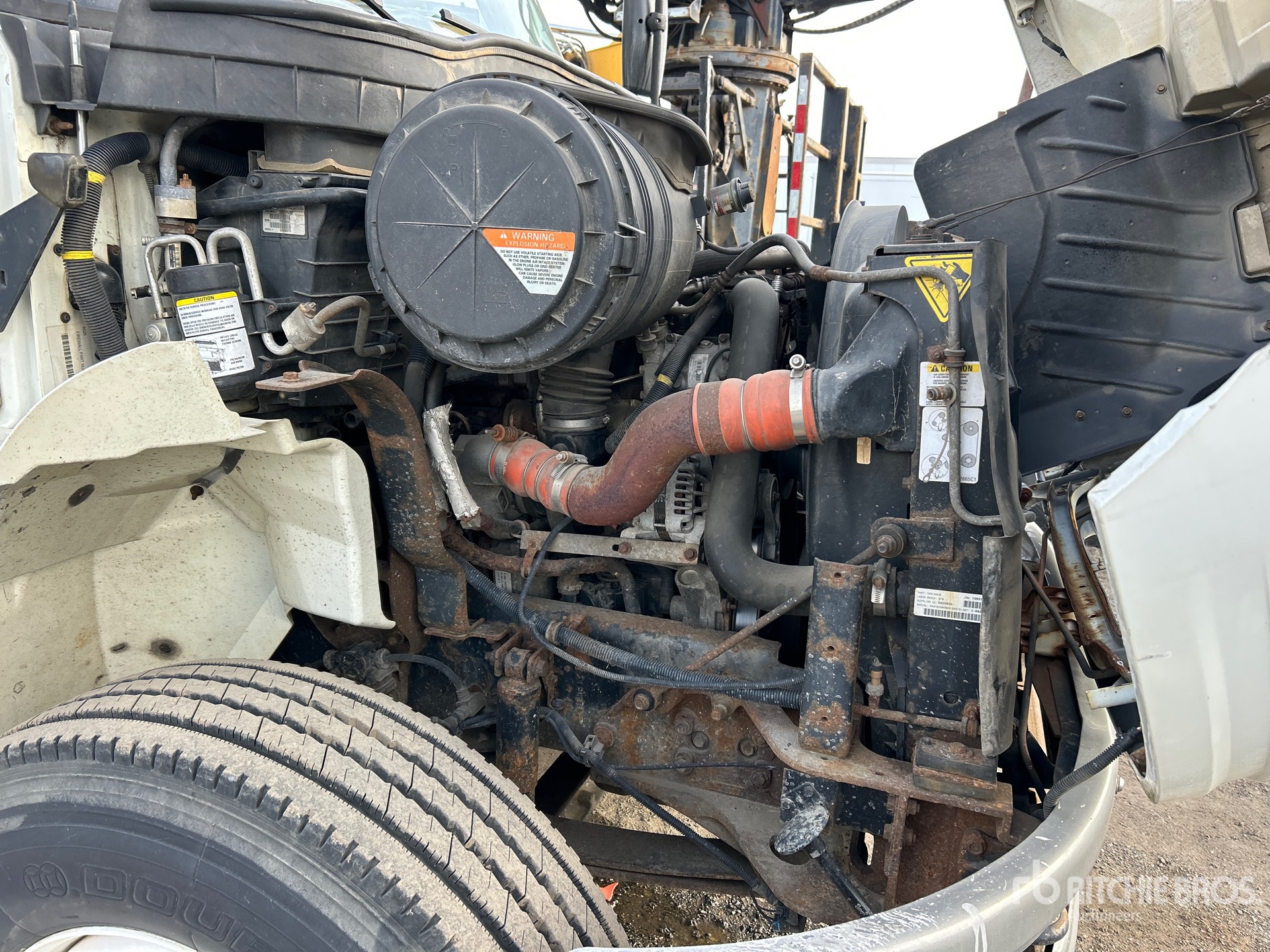 International MaxxForce DT 6 Cylinder Diesel Engine, 12705 Engine hrs, Allison Automatic Transmission, 12000 lb Front Axle, 21000 lb Rears, 33000 lb GVWR, 11R22.5, Spring Suspension, 188 in Wheelbase, 600 lb Capacity, Rear Mounted, One-Person Boom, Utility Body, A-Outriggers, 15 ft x 96 in Bed