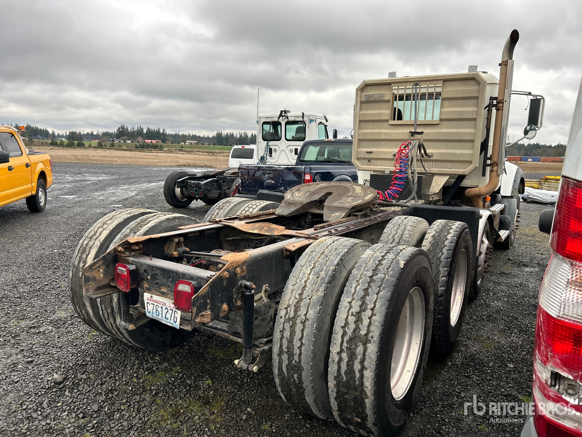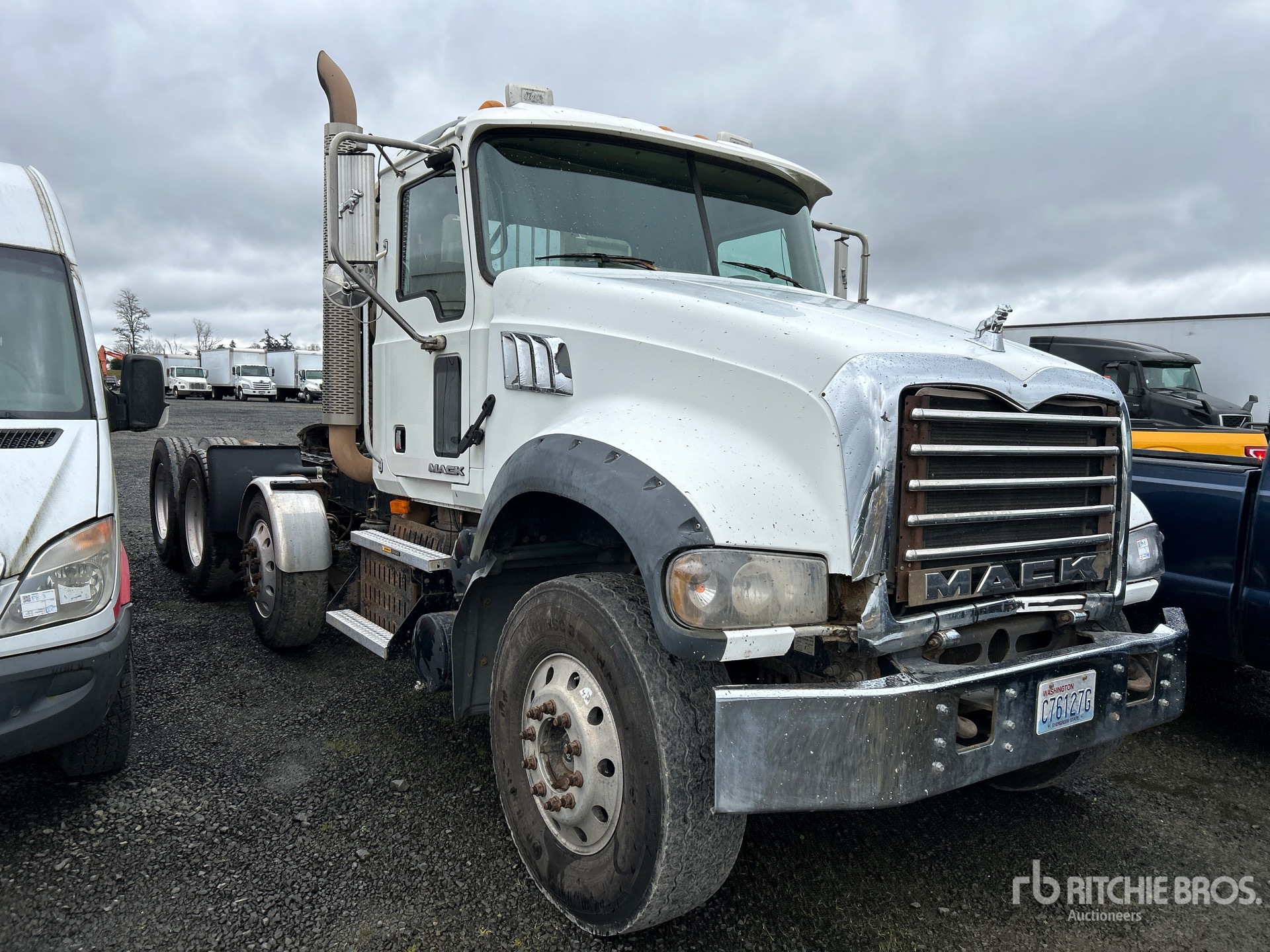 Mack Engine, Mack Manual Transmission, 13220 lb Front Axle, 44000 lb Rears, 57220 lb GVWR, 228 in Wheelbase, Air Suspension, Air Lift Pusher Axle, Aluminum Wheels, 315/80R22.5 Front Tires, 11R24.5 Rear Tires, Wet Kit, Air Sliding 5th Wheel, Headache Rack