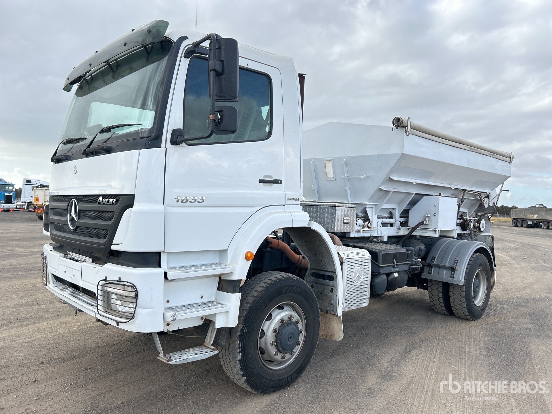 6 Cylinder Diesel Engine, Requires AdBlue, 14746 Engine hrs, Exhaust Brake, 8-Speed Manual Transmission, 315/80R22.5 Front Tires, 295/80R22.5 Rear Tires, Spring Suspension, 4200 mm Wheelbase, PTO, Hydraulic System, Bartlett tow bar, Marshall Multispread 880 TM Super Body 3500 mm Body, 810 mm Discharge Conveyor, Dual Spinners GVM 18 t
