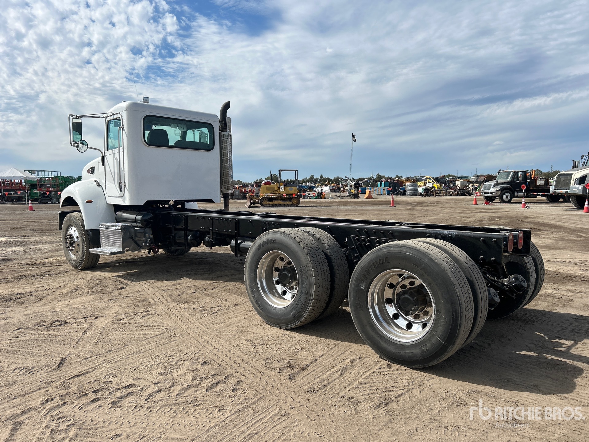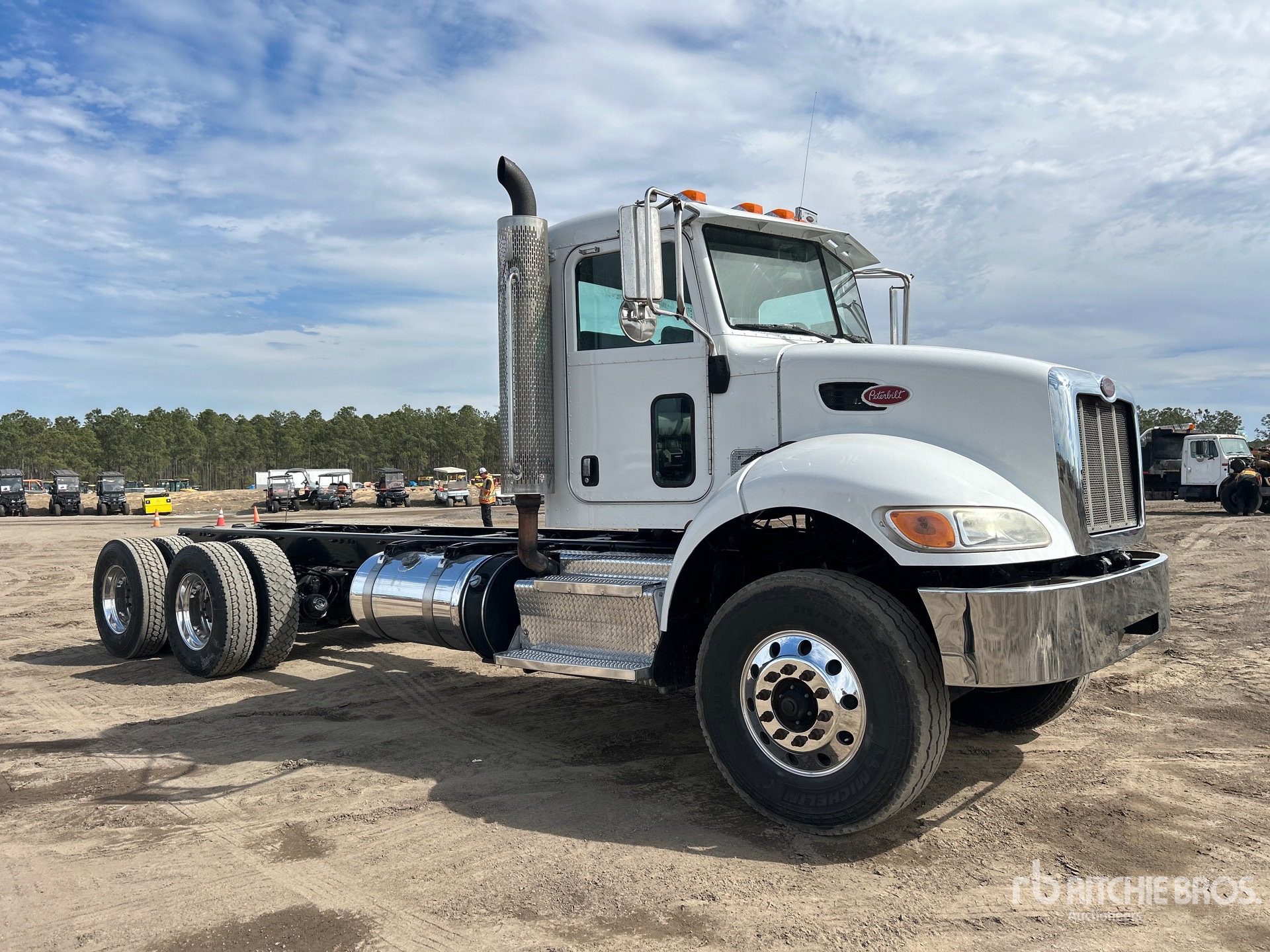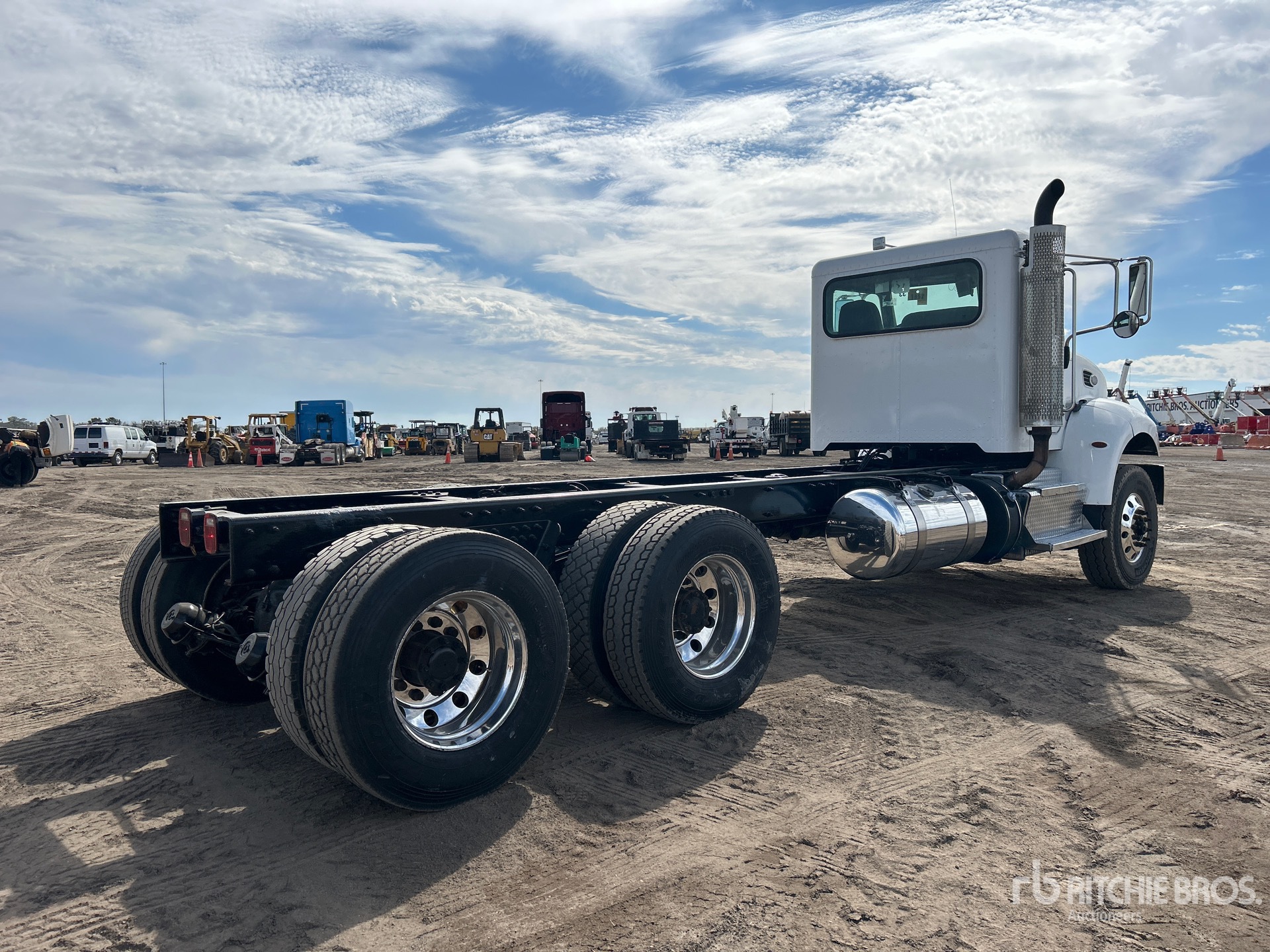Paccar PX-8 6 Cylinder Diesel Engine, Requires Diesel Exhaust Fluid, 34707 Engine hrs, Automatic Transmission, 14600 lb Front Axle, 46000 lb Rears, 60000 lb GVWR, Aluminum Outer Wheels, 315/80R22.5 Front Tires, 11R22.5 Rear Tires, Dual Steering Boxes, Double Frame, Rubber over Walking Beam Suspension, 238 in Wheelbase, 165 in Cab to Axle, 214 in Cab to End of Frame