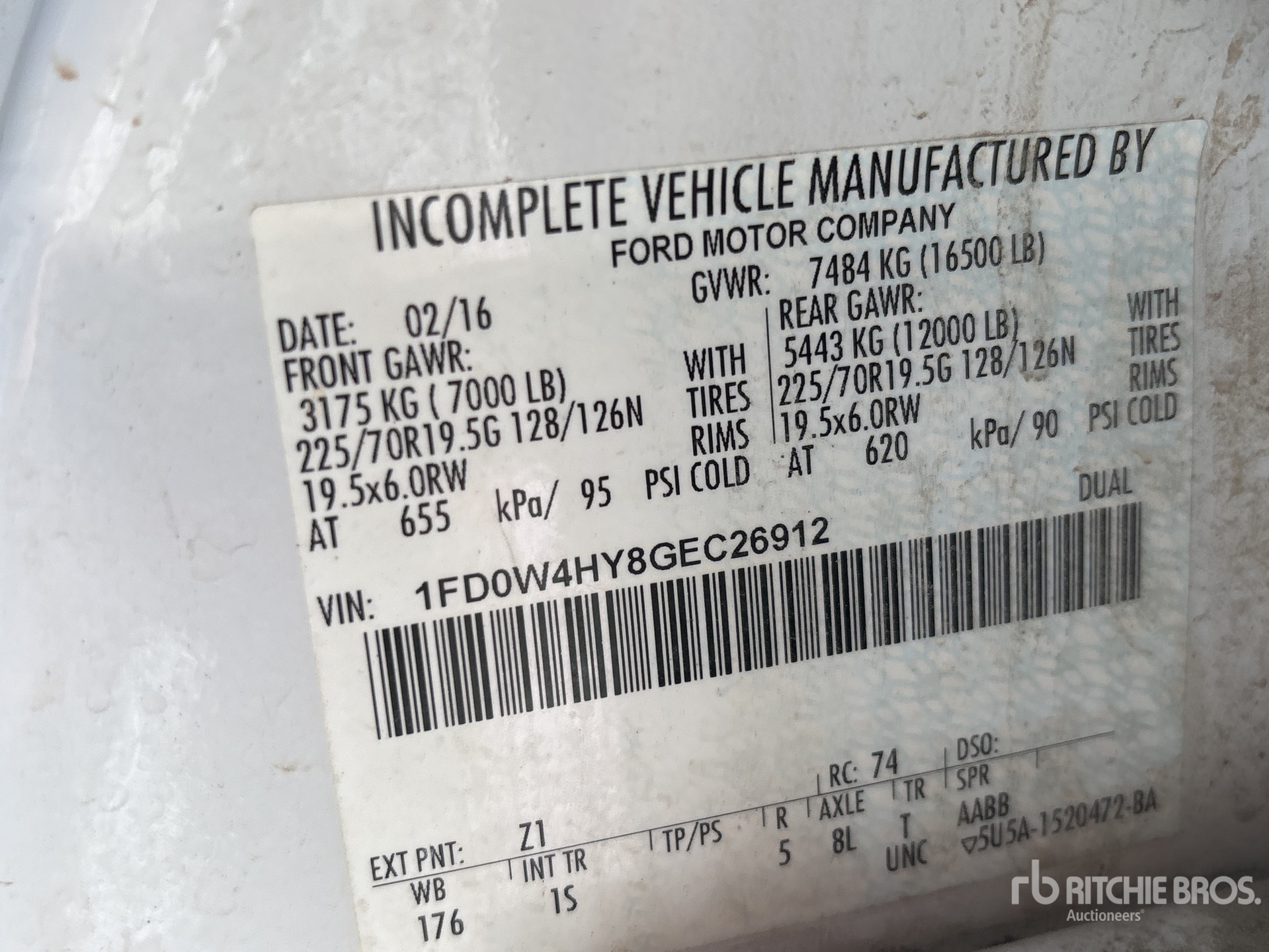 FOMOCO V8 6.8 L Gasoline Engine, 2015 US EPA Label, Automatic Transmission, 7000 lb Front Axle, 12000 lb Rears, 16500 lb GVWR, 225/70R19.5, Spring Suspension, 176 in Wheelbase, 60 in Cab to Axle, 122 in Cab to End of Frame, Ball hitch