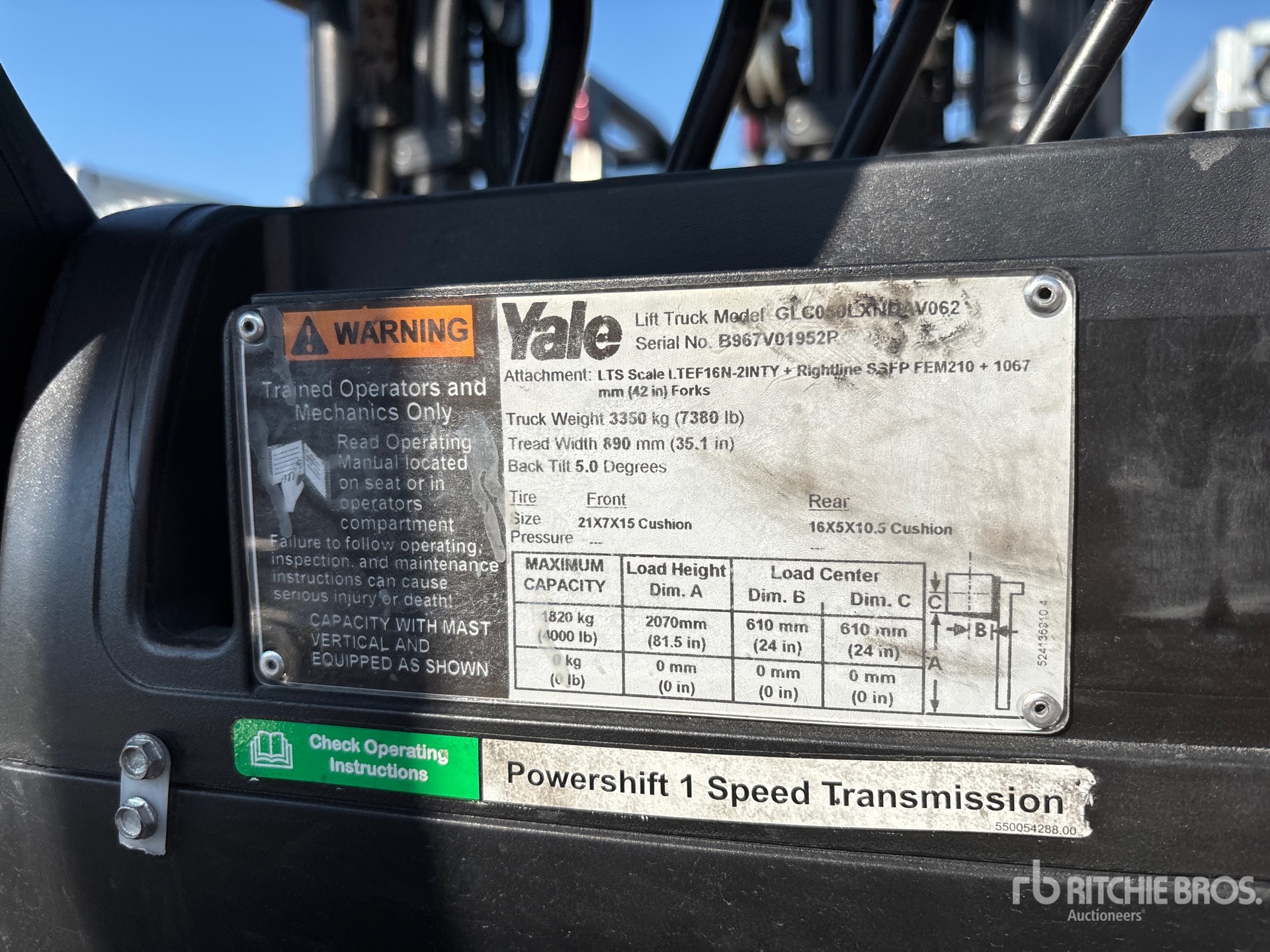 2 Stage Mast, 81 in Max Lift Height, 58 in Lowered Mast Height, 41 in Forks, Side Shift, Fork Positioner, Solid Pneumatic Tires, 2016 US EPA Label, 4 Cylinder 2.4 L LPG Engine