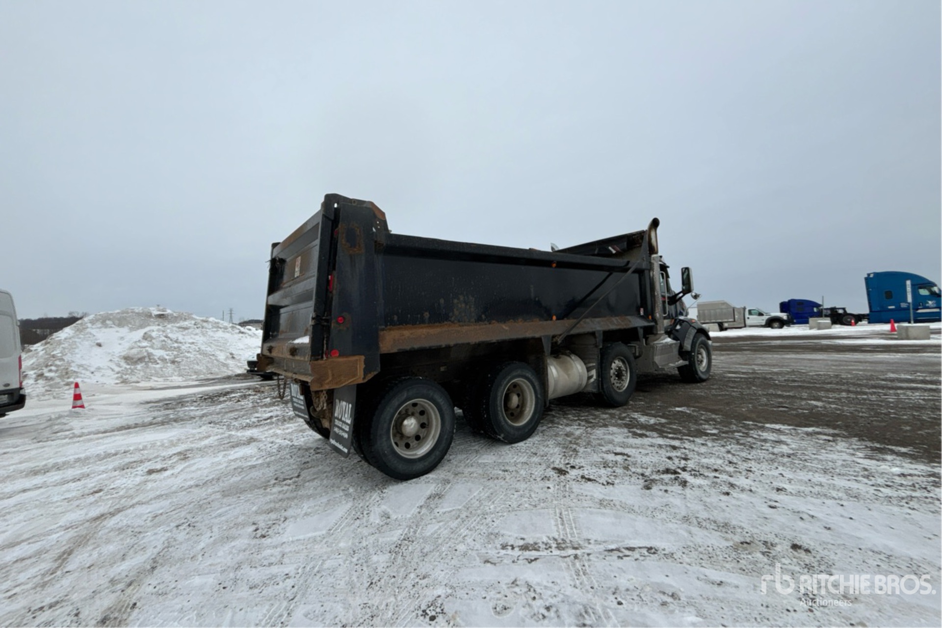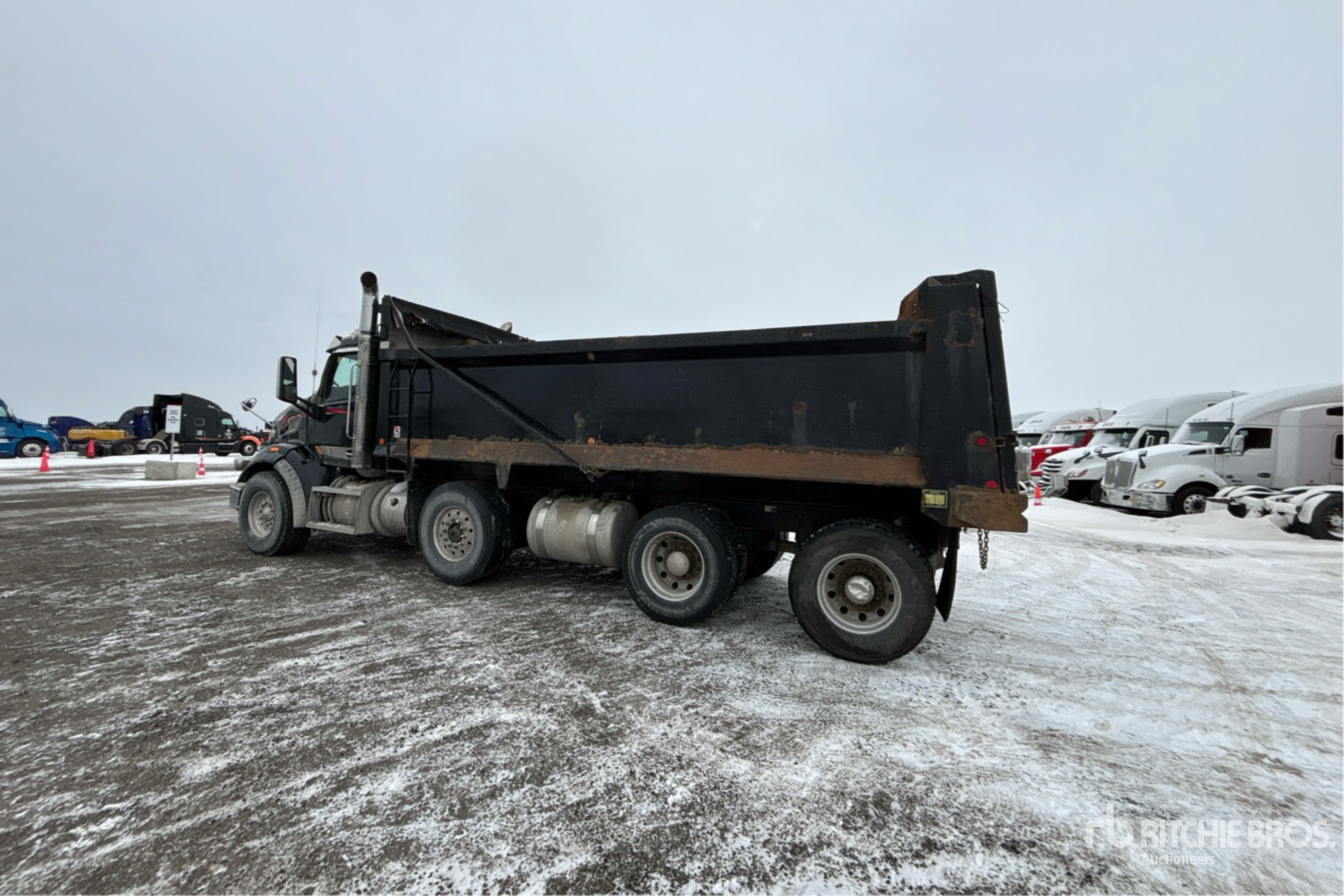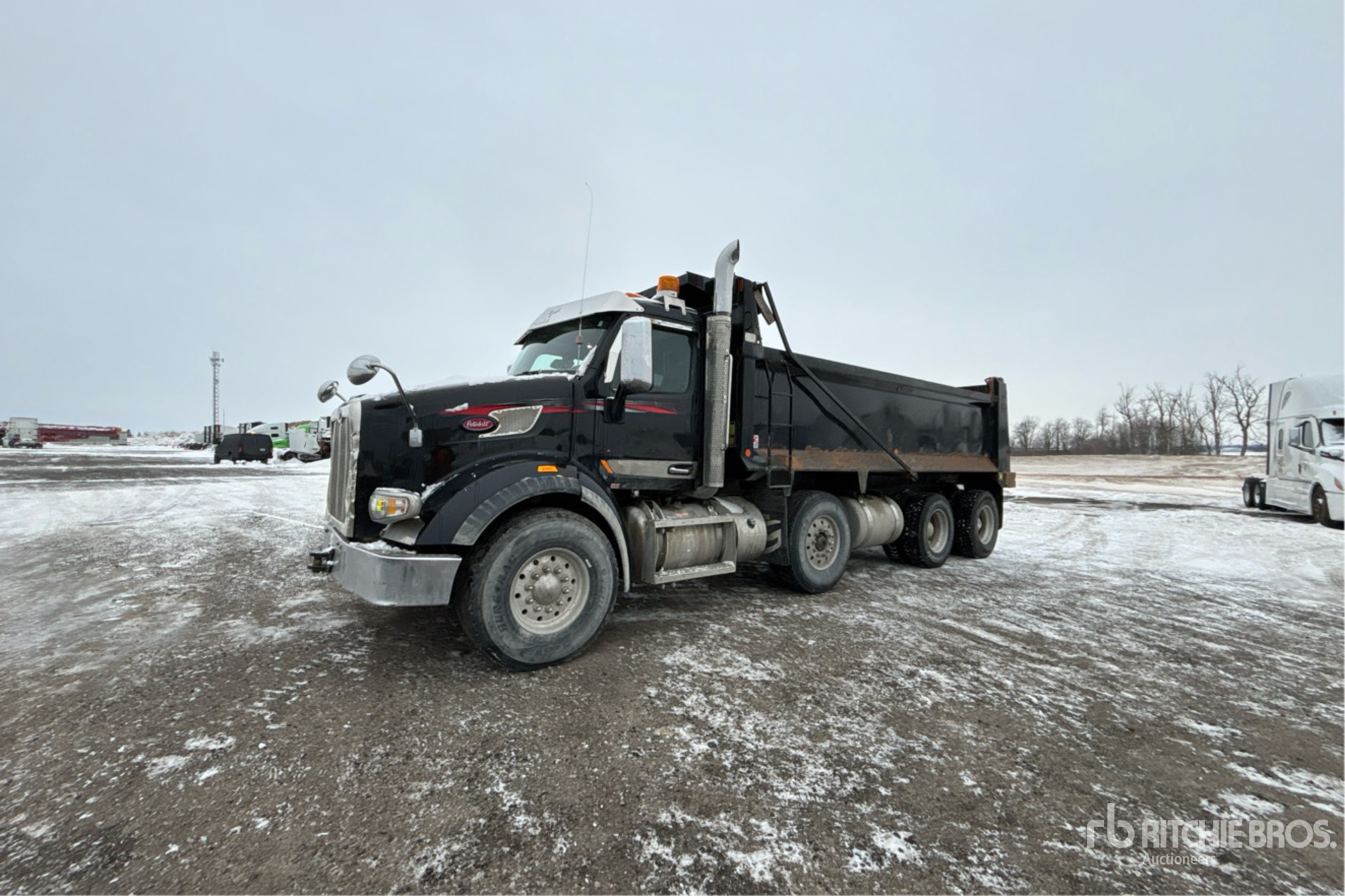 Paccar MX-13 Diesel 500 hp Engine, 2016 US EPA Label, CARB Compliant, Requires Diesel Exhaust Fluid, Engine Brake, Automatic Transmission, Double Differential Locks, 20000 lb Front Axle, 66000 lb Rears, 80000 lb GVWR, Air Ride Cab, Aluminum Wheels, 425/65R22.5 Front Tires, 11R22.5 Rear Tires, Steerable Air Lift Pusher Axle, Steerable Air Lift Tag Axle, Double Frame, Air Ride Suspension, 260 in Wheelbase, PTO, 20 ft Long x 4 ft High Steel Body, Air Powered Roll Tarp, Swing Tailgate, Pintle Hitch