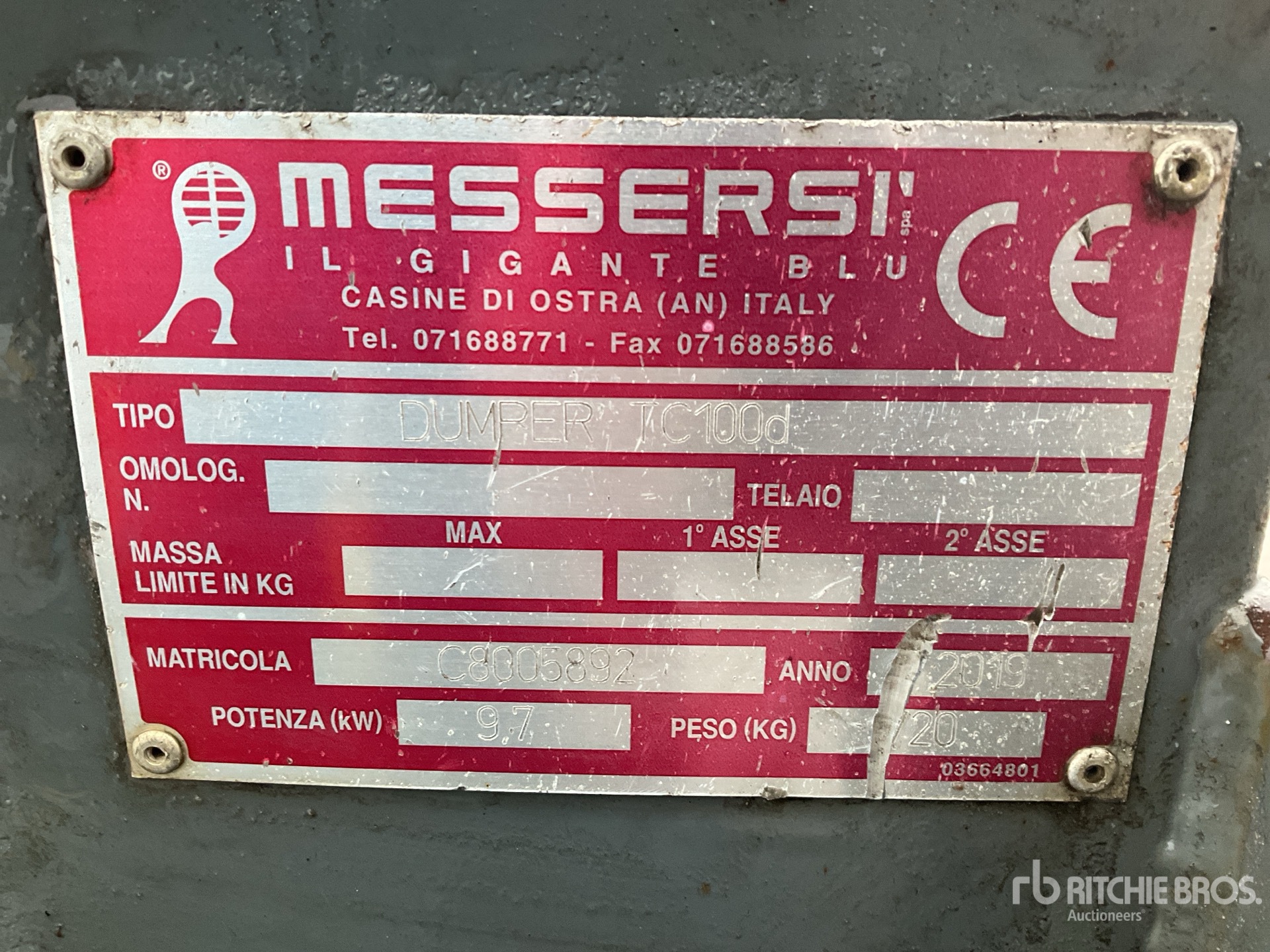 Le descrizioni dettagliate degli articoli non sono complete, Ritchie Bros. Auctioneers non ha effettuato alcuna ispezione delle componenti dell'articolo, salvo quelle espressamente indicate di seguito. Salvo espressamente indicato, non verrà fornita alcuna dichiarazione o garanzia, espressa o implicita, riguardante il funzionamento dell'articolo e delle sue componenti, incluso descrizioni o garanzie relative a funzionamento, conformità o osservanza di standard o requisiti di sicurezza eventualmente previsti da organi di vigilanza o competenti, dichiarazioni di idoneità o commerciabilità. Si raccomanda di prendere personalmente visione di ogni componente dell'articolo in modo accurato prima di fare un'offerta.