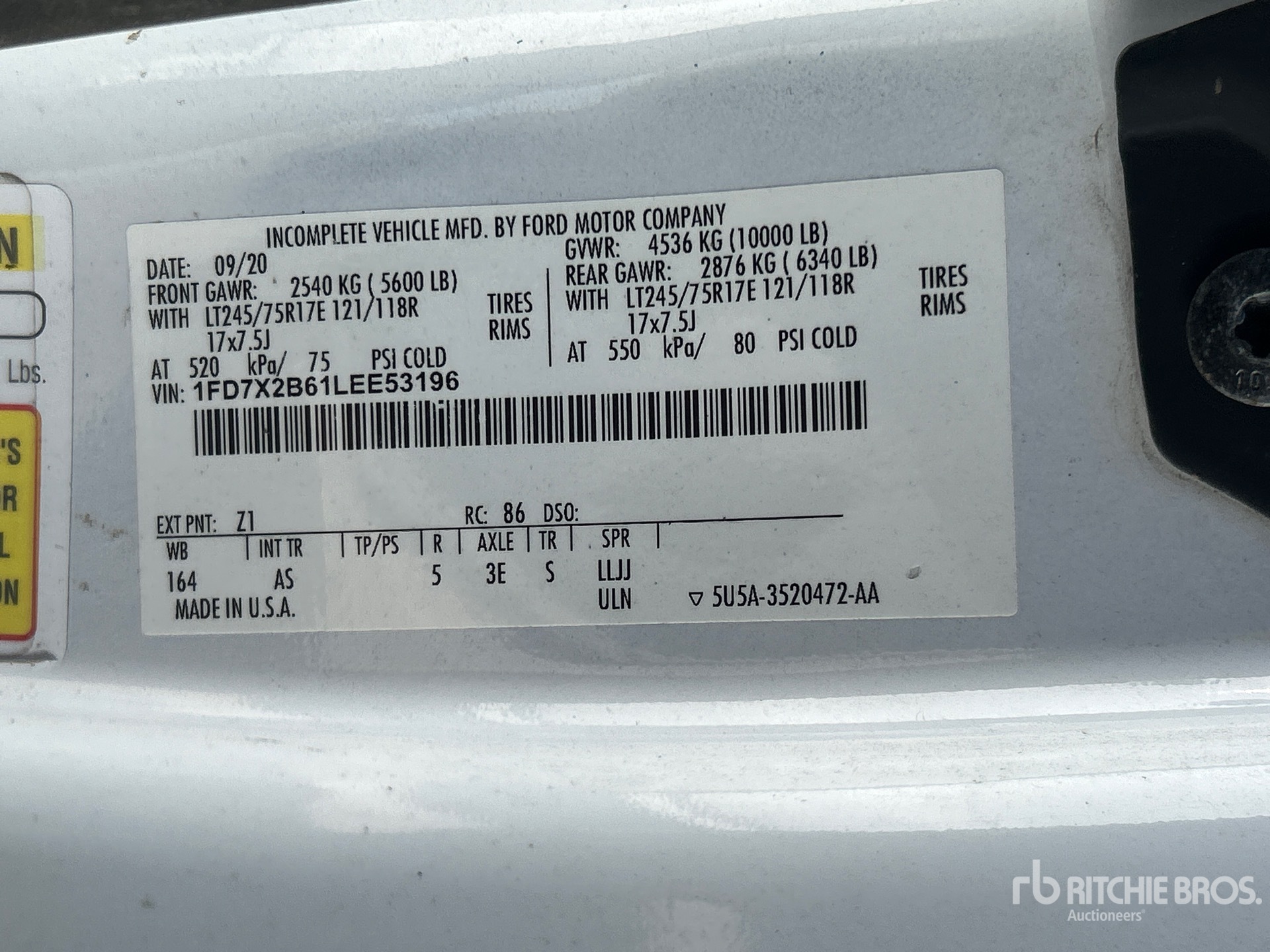 Ford V8 6.2 L Gasoline Engine, 2020 US EPA Label, Automatic Transmission, 5600 lb Front Axle, 6340 lb Rears, 10000 lb GVWR, 245/75R17, Spring Suspension, 164 in Wheelbase, 57 in Cab to Axle, 105 in Cab to End of Frame