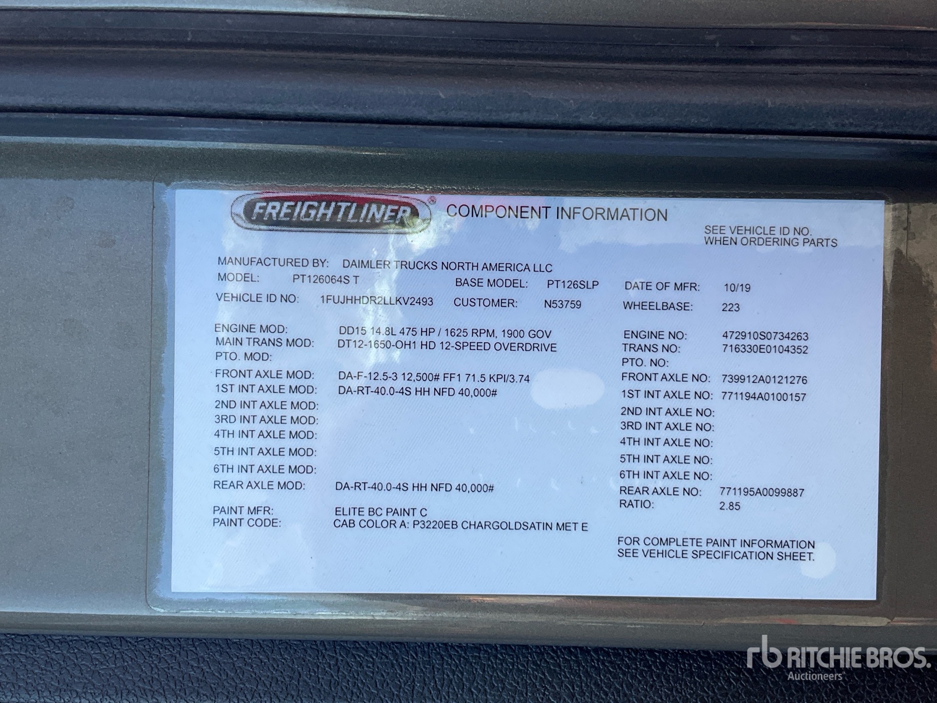 Detroit DD15 475 hp Engine, 2019 US EPA Label, 24361.18 Engine hrs, Detroit DT12-1650-OH1 12-Speed Automated Transmission, 12500 lb Front Axle, 40000 lb Rears, 52500 lb GVWR, Engine Brake, 72 in High Rise Sleeper Cab, Bunk Beds, 223 in Wheelbase, Air Suspension, Aluminum Outer Wheels, 275/80R22.5, Air Sliding 5th Wheel