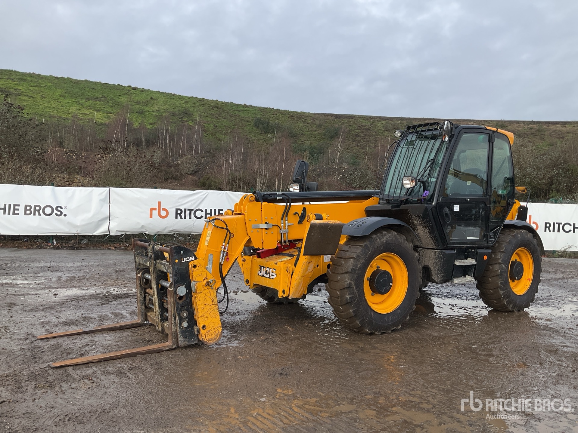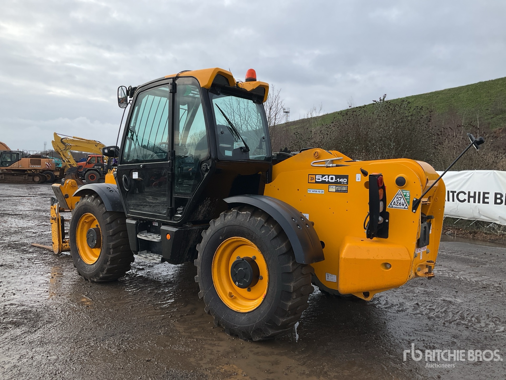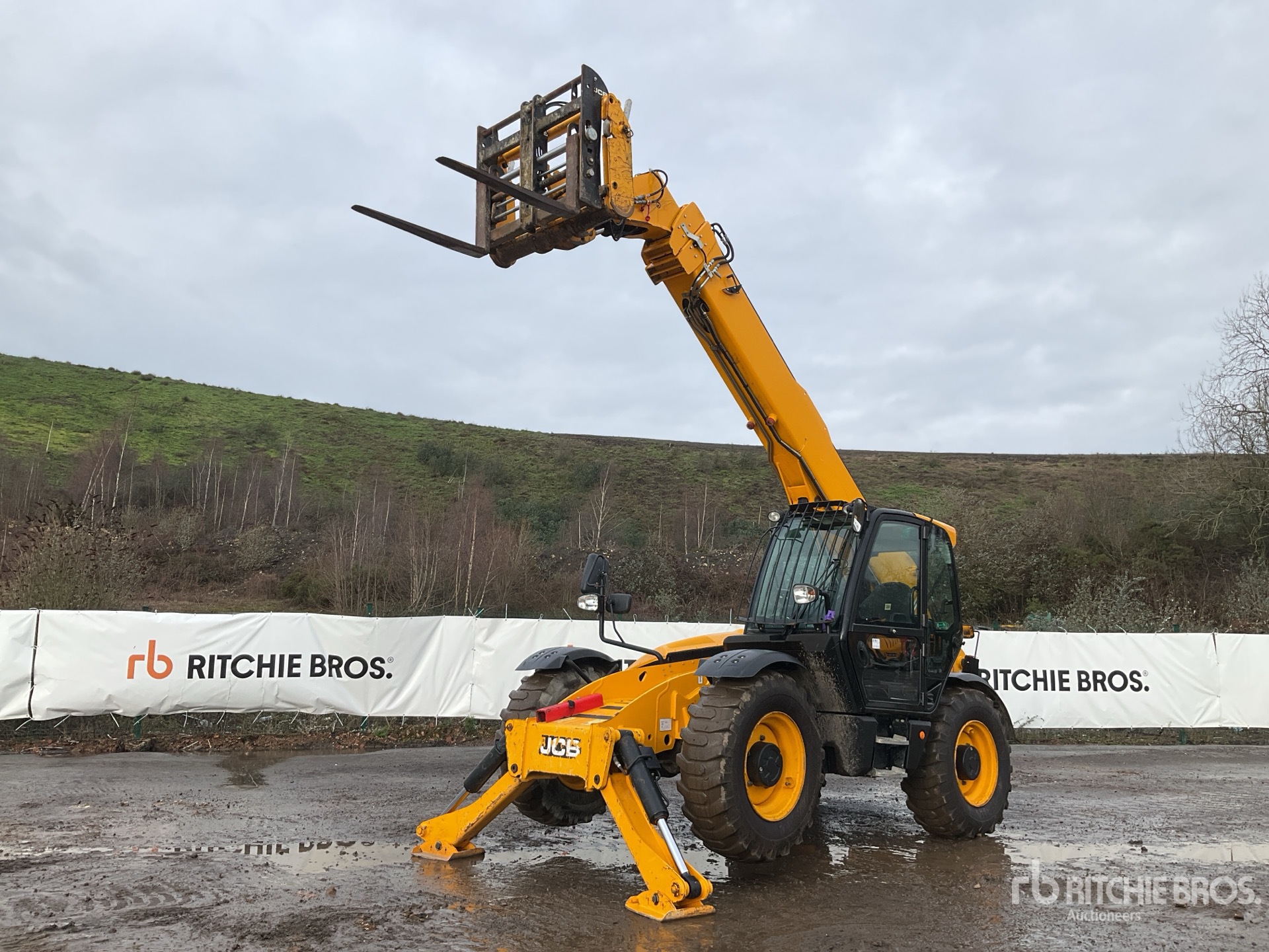 Enclosed Cab, Air Conditioner, Rear View Camera, Load Moment Indicator, 13.78 m Max Lift Height, 4000 kg Max Lift Capacity, 1050 mm Forks, Fork Positioner, Manual Coupler, Outriggers, Auxiliary Hydraulic Plumbing, 15.5-25 Tires