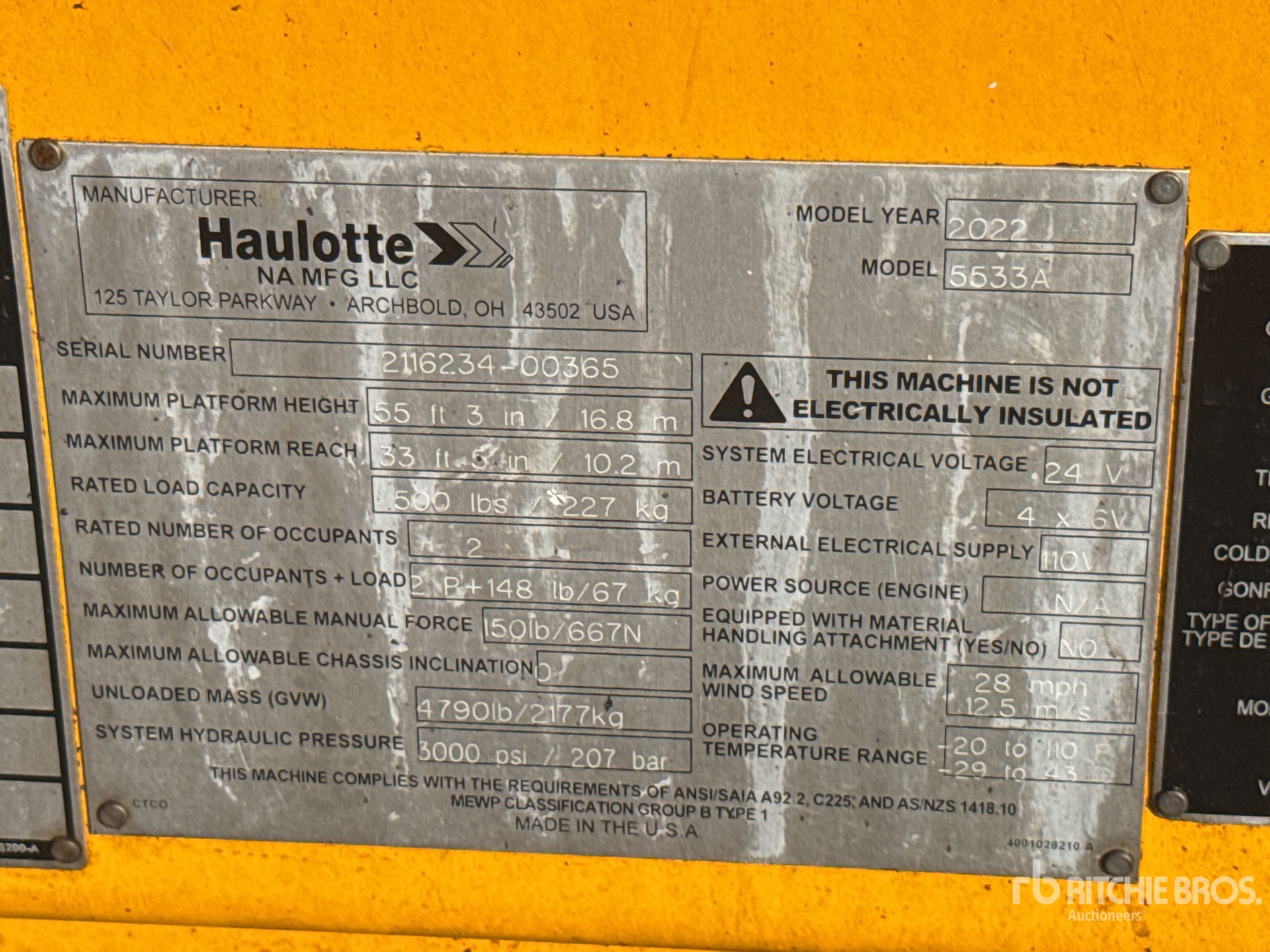 55 ft Max Platform Height, 500 lb Max Weight Capacity, Jib, Power to Platform