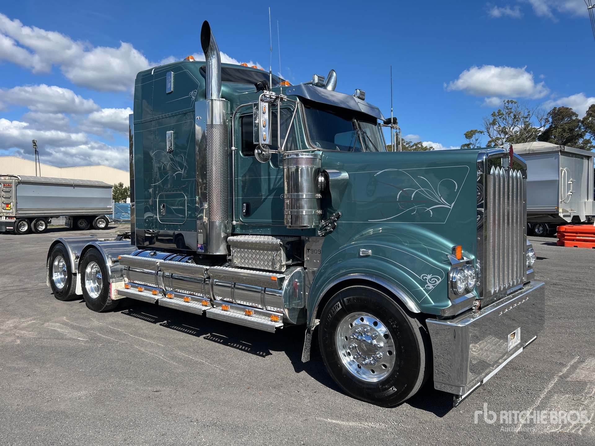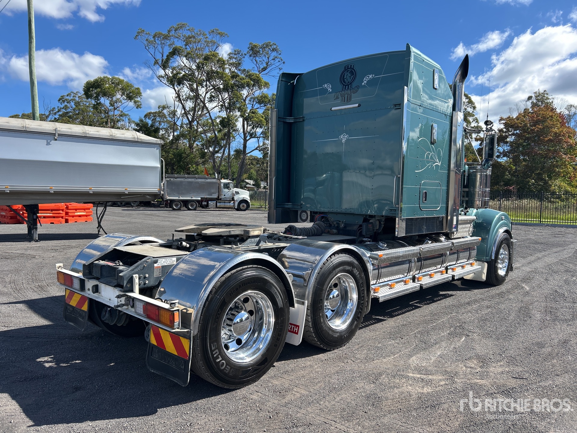 Cummins X15 600 hp Engine, 8144 Engine hrs, Eaton Fuller 18-Speed 46000 lb Rears, Engine Brake, Double Differential Locks, Coolabah Sleeper Air Conditioner, 5800 mm Wheelbase, 8-Bag Air Suspension, 295/80R22.5 Front Tires, 11R22.5 Rear Tires, Hydraulic System, GVM 27.8 t, GCM 97 t, Right Weigh Load Scales, equipment-from-b&t-haulage