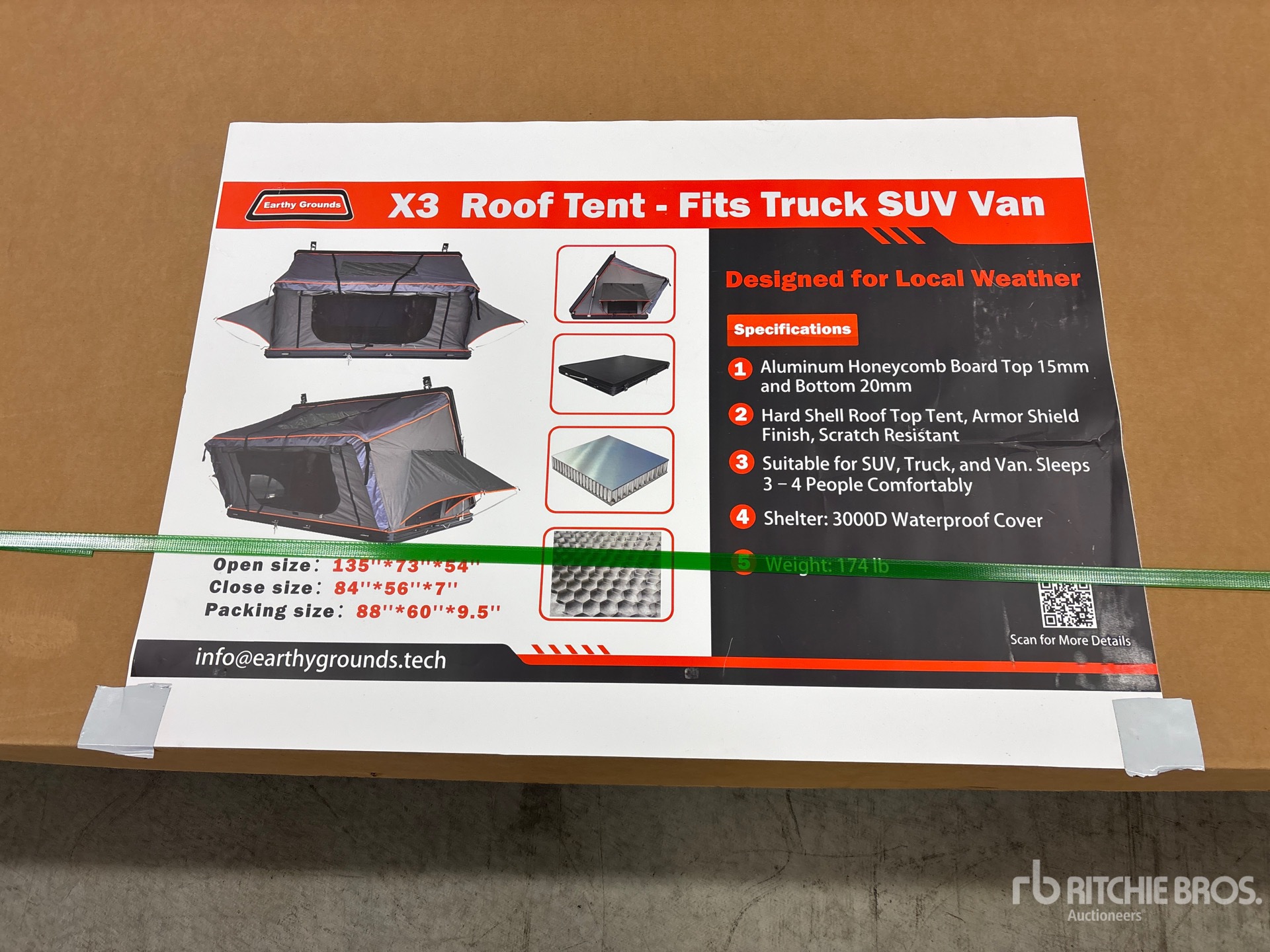 Fits trucks, SUVs, and Vans, Open: 135 in × 73 in × 54 in / Closed: 84 in × 56 in × 7 in, Canadian-designed for BC's local weather, Aluminum honeycomb hard-shell rooftop tent with 15 mm top and 20 mm bottom panels, Armor-shield finish, scratch-resistant, Sleeps 3-4 adults, 3000D waterproof cover