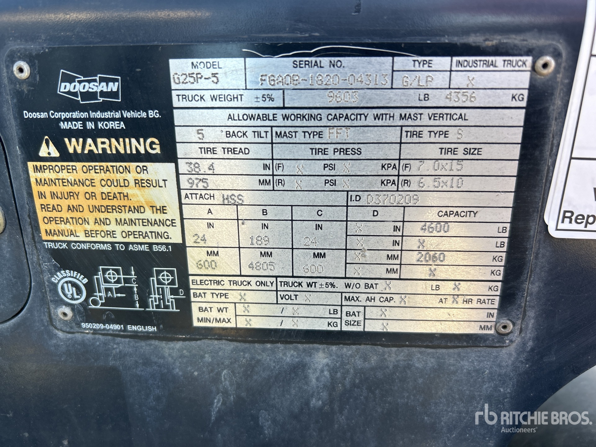 Le descrizioni dettagliate degli articoli non sono complete, Ritchie Bros. Auctioneers non ha effettuato alcuna ispezione delle componenti dell'articolo, salvo quelle espressamente indicate di seguito. Salvo espressamente indicato, non verrà fornita alcuna dichiarazione o garanzia, espressa o implicita, riguardante il funzionamento dell'articolo e delle sue componenti, incluso descrizioni o garanzie relative a funzionamento, conformità o osservanza di standard o requisiti di sicurezza eventualmente previsti da organi di vigilanza o competenti, dichiarazioni di idoneità o commerciabilità. Si raccomanda di prendere personalmente visione di ogni componente dell'articolo in modo accurato prima di fare un'offerta.