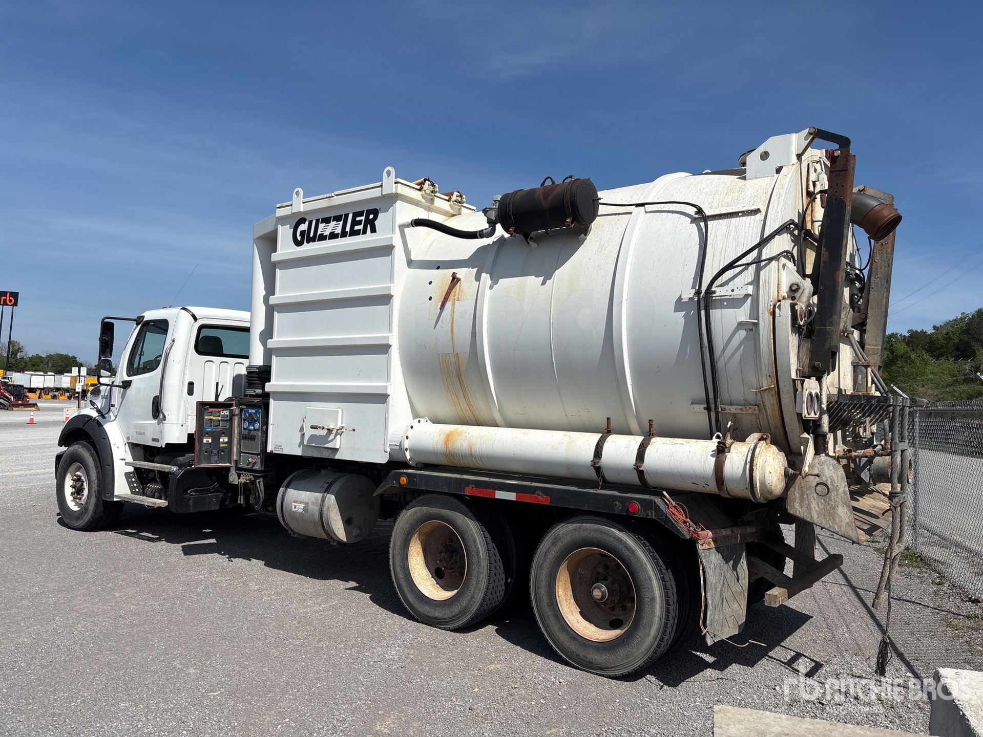 Detroit DD13 6 Cylinder 12.8 L Diesel 410 hp Engine, 2011 US EPA Label, Requires Diesel Exhaust Fluid, Engine Brake, Eaton Fuller FRO-14210C 10-Speed Manual Transmission, 20000 lb Front Axle, 46000 lb Rears, 430:1 Axle Ratio, 66000 lb GVWR, 425/65R22.5 Front Tires, 11R22.5 Rear Tires, Dual Steering Boxes, Double Frame, Hendrickson RT/RTE Series Spring over Walking Beam Suspension, 260 in Wheelbase, Steel Debris Tank, Vibrator, Hydraulic Lift Tailgate, Hydraulic Tailgate Locks, Guzzler PTO Driven Pump, Ingersoll Rand SIAV 8702 Blower