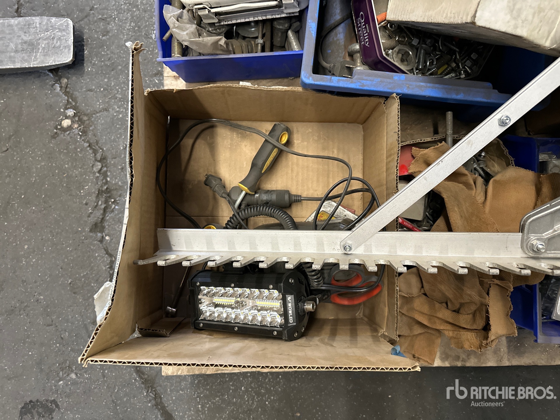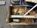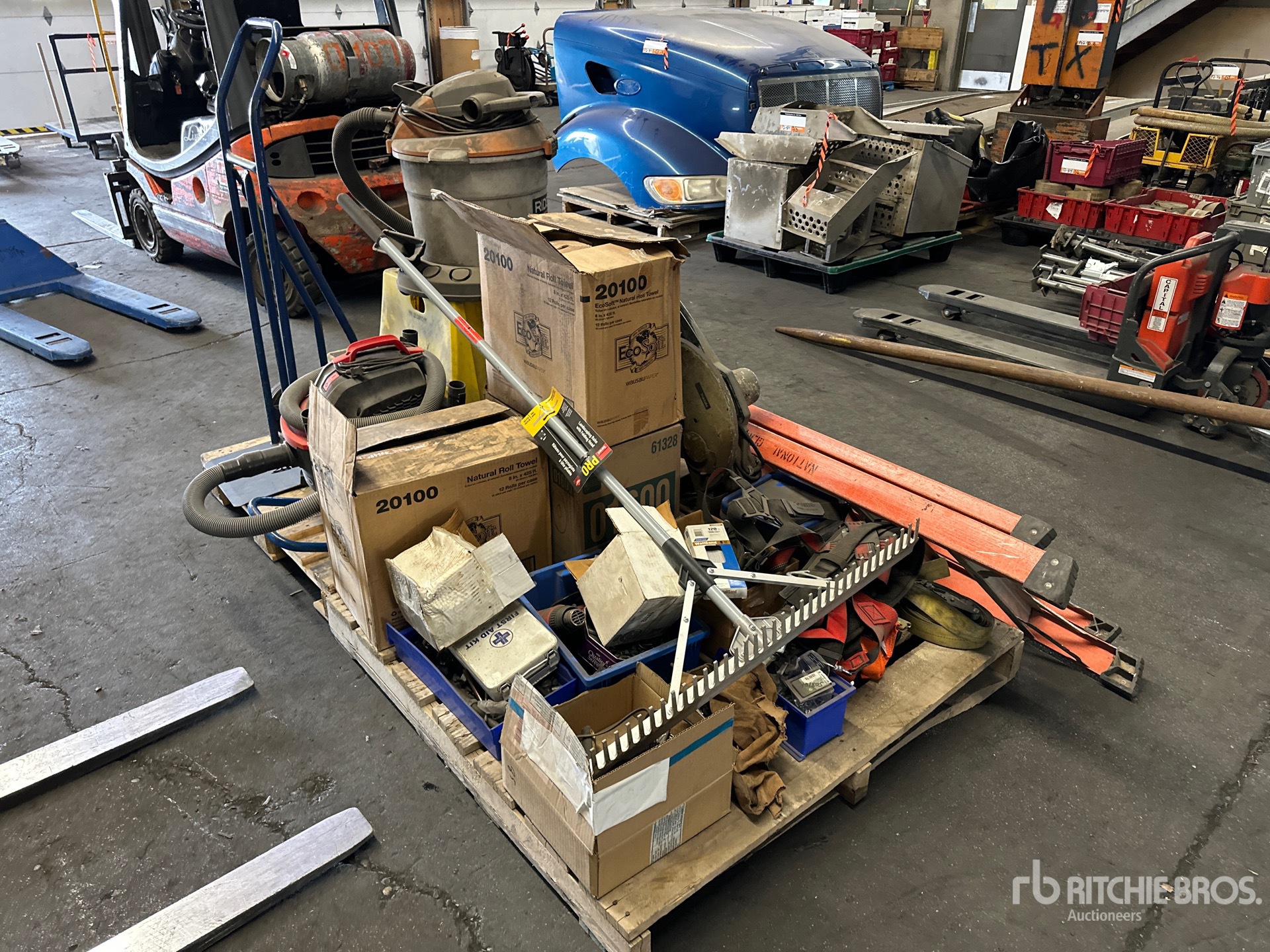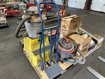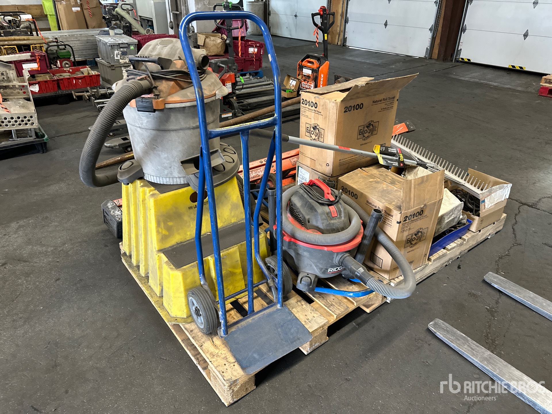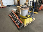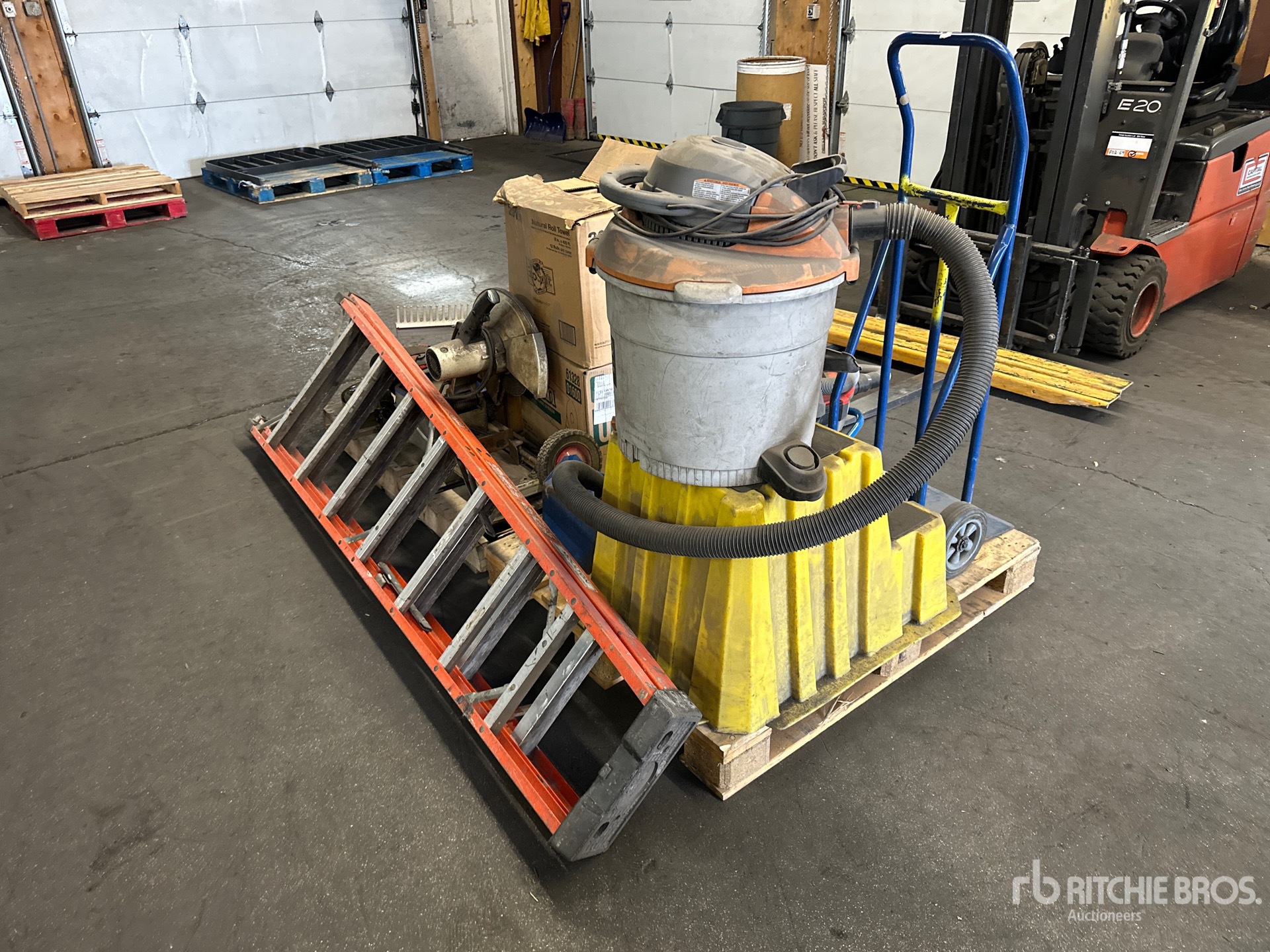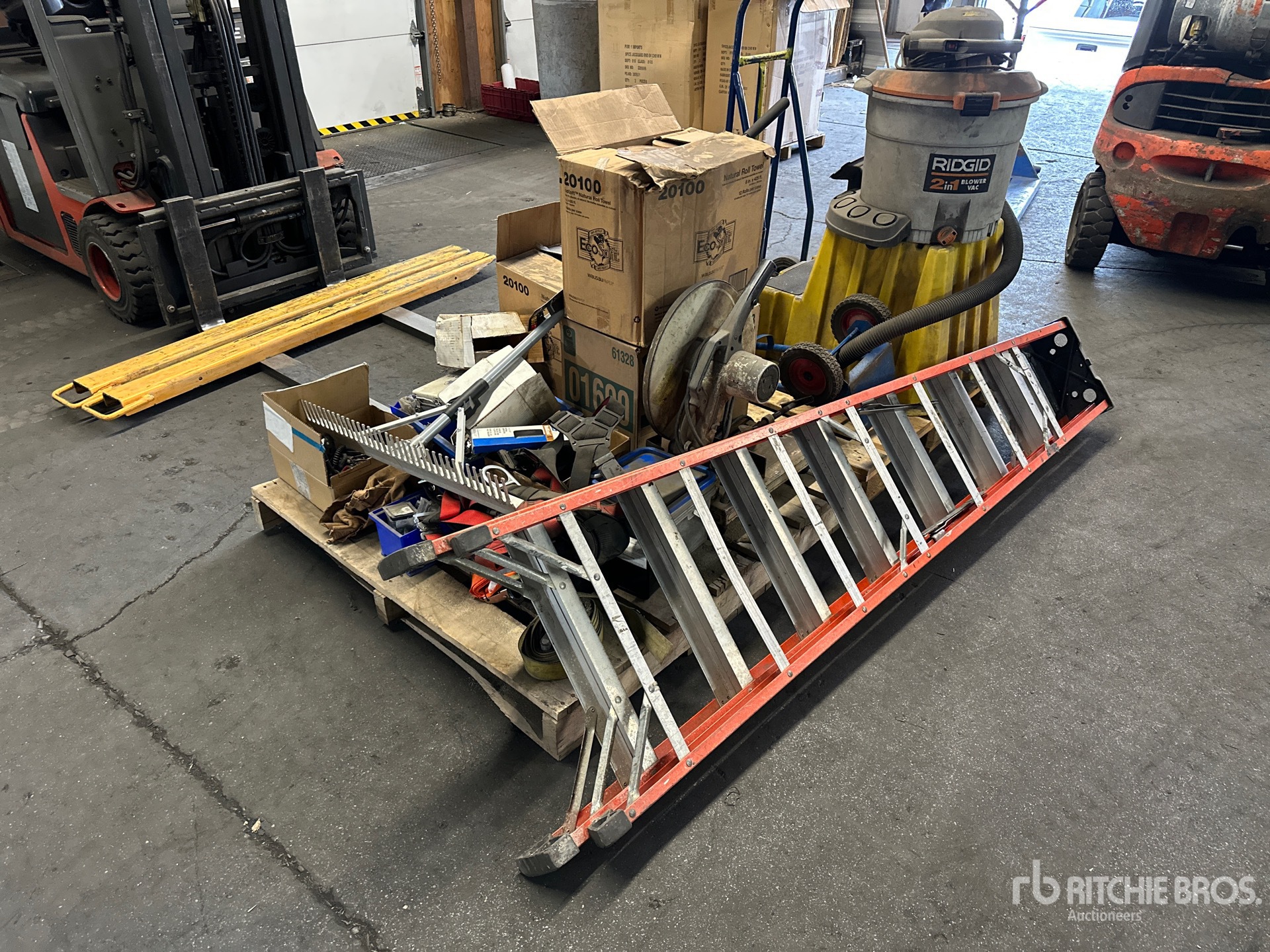 Chop Saw, Bottle Dolly, (2) Shop Vacs, Landscape Rake, Ladder, LED Light, Safety Harness, Nuts, Bolts, Shop Stair, Paper Towel Rolls